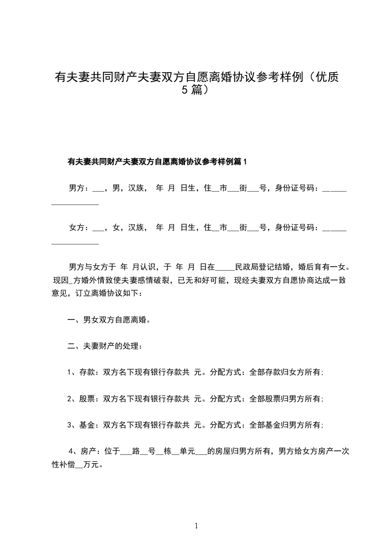 1、存款:双方共同存款____________万平分,双方各自名下的存款保持不变,归各自所有;