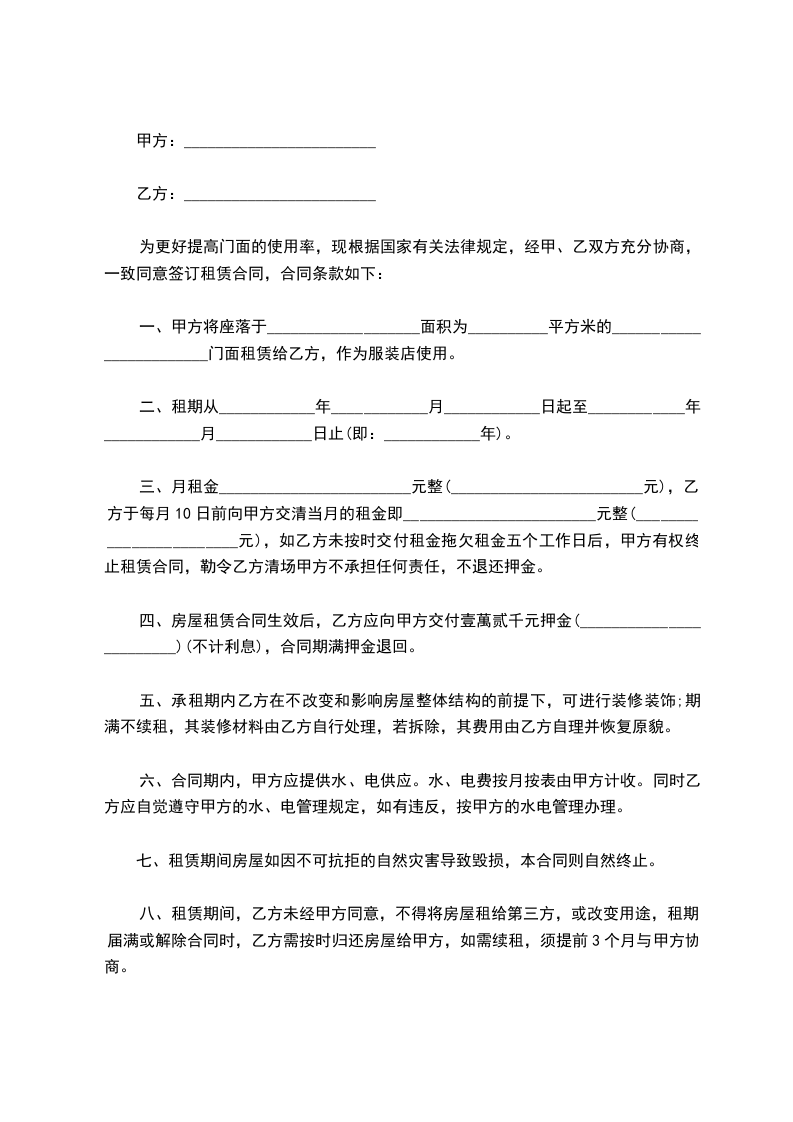 2.水电费:由乙方自行缴纳;(水表表底数为__________________度,电表底数为______________度,此度数以后的费用由乙方承担,直至合同期满)。