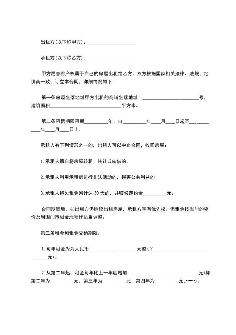 一、甲方将位于_______________________门面租赁给乙方。甲方对所出租的房屋具有合法产权。