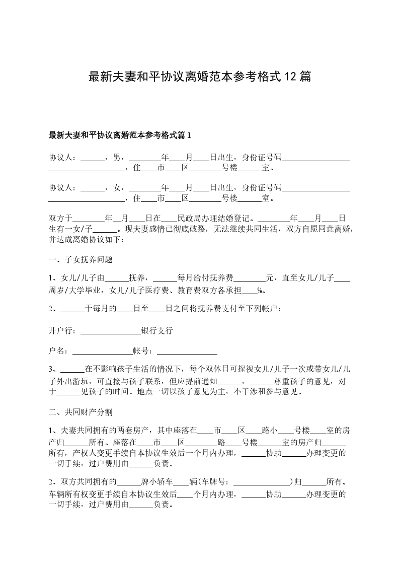 (1)存款:双方名下现有银行存款共______元,双方各分一半,为______元。分配方式:各自名下的存款保持不变,但男方(女方)应于____年__月__日前一次性支付____元给女方(男方)。