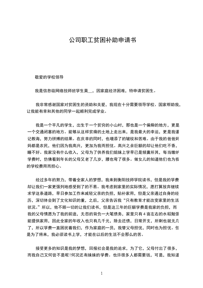 我是信息级网络技师班学生莫__,因家庭经济困难,特申请贫困生。