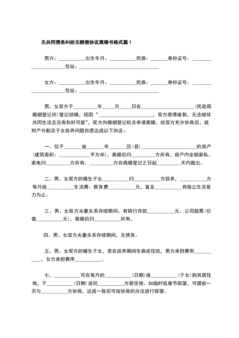 无共同债务纠纷无赔偿协议离婚书格式篇2