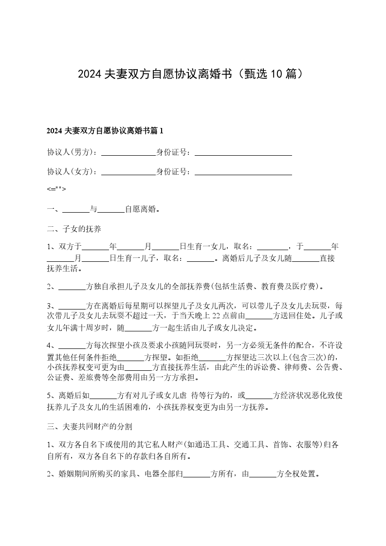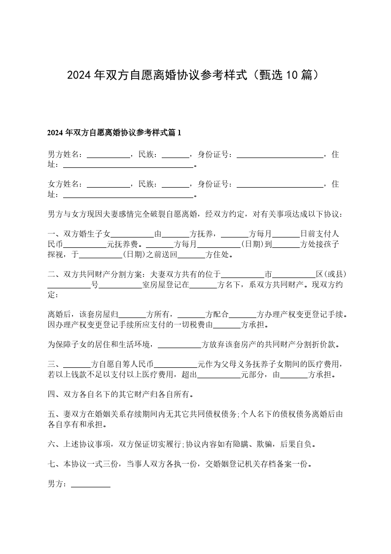 2024年双方自愿离婚协议参考格式篇10