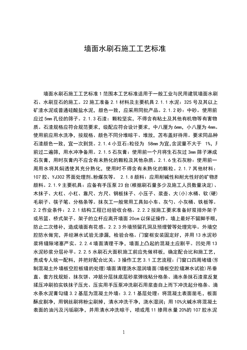 墙面水刷石施工工艺标准1范围本工艺标准适用于一般工业与民用建筑墙面水刷石、水刷豆石的施工。22施工准备2.1材料及主要机具2.1.1水泥:325号及其以上矿渣水泥或普通硅酸盐水泥,颜色一致,应采用同批产品。2.1.2砂:中砂。使用前应过5mm孔径的筛子。2.1.3石渣:颗粒坚实,不得含有粘土及其他有机物等有害物质。石渣规格应符合规范要求,级配应符合设计要求,中八厘为6mm,小八厘为4mm。使用前应用水洗净,按规格、颜色不同分堆晾干、堆放,苫布盖好待用。要求同品种石渣颜色一致,宜一次到货。2.1.4小豆石:粒径为58mm为宜,含泥量不大于1%,用前过二遍筛,用水冲净备用。2.1.5石灰膏:使用前一个月将生石灰过3mm筛子淋成石灰膏,用时灰膏内不应含有未熟化的颗粒及其他杂质。2.1.6生石灰粉:使用前一周用水将其焖透使其充分熟化,使用时不得含有未熟化的颗粒。2.1.7其他材料:107胶、YJ302界面处理剂、粉煤灰等。2.1.8颜料:应用耐碱性和耐光性好的矿物质颜料。2.1.9主要机具:应备有手压泵23台(根据刷石量多少及施工人员数量决定)、木抹子、大杠、小杠、靠尺、方尺、钢板抹子、小压子、浆壶、大(小)水桶、软(硬)毛刷子、筷子笔、分格条等。抹灰工一般常用工具如小车、灰勺、小灰桶、铁板等。2.2作业条件:2.2.1结构工程已经验收合格。2.2.2按施工要求准备好双排外架子或吊篮、桥式架子。架子的立杆应离开墙面20cm以保证操作。墙上最好不留脚手眼,防止二次修补,造成墙面有花感。2.2.3外墙预留孔洞及预埋管等处理完毕。外墙空腔防水做完,并经淋水试验无渗漏,检验合格。门窗框安装固定好,并用13水泥砂浆将缝隙堵塞严实。2.2.4墙面清理干净,墙面上凸起的混凝土应剔平。凹处用13水泥砂浆分层补平。2.2.5水刷石大面积施工前应先做样板,确定配合比和施工艺,责成专人统一配料,并把好配合比关。3操作工艺3.1工艺流程:门窗口四周堵缝(预制混凝土外墙板空腔板缝的处理)墙面清理浇水湿润墙面(墙板空腔缝淋水试验)吊垂直、套方找规矩、抹灰饼、冲筋分层抹底层砂浆弹线粘分格条、滴水条抹石渣浆反复揉压冲刷拍实铁抹子压光、压实用手压泵冲洗刷石用浆壶自上而下冲洗起分格条、滴水条水泥膏勾缝3.2基层为混凝土外墙:3.2.1基层处理:将混凝土表面凿毛,板面酥皮剔净,用钢丝刷将粉尘刷掉,清水冲洗干净,浇水湿润;用10%火碱水将混凝土表面的油污及污垢刷净,并用清水冲洗晾干,喷或甩11掺用水量20%的107胶水泥细砂浆一道。终凝后浇水养护,直至砂浆与混凝土板粘牢(用手掰砂浆不脱落),方可进行打底;或采用YJ302混凝土界面处理剂对基层进行处理,其操作方法有两种:第一种,在清洗干净的混凝土基体上,涂刷“处理剂”一道,随即紧跟着抹水泥砂浆,要求抹灰时处理剂不能干。第二种,刷完处理剂后撒一层粒径为23mm的砂子,以增加混凝土表面的粗糙度,待其干硬后再进行打底。3.2.2吊垂直、套方找规矩:若建筑物为多层,应用特制的大线坠从顶层往下吊垂直,并绷铁丝后,按铁丝的垂直要求在大角、门窗洞两侧等分层抹灰饼。若为高层时,应在大角、门窗洞口等垂直方向用经纬仪打垂直线,并按线分层抹灰饼找规矩,使横竖方向达到平整一致。3.2.3抹底层砂浆:按以上所抹的灰饼标高充筋,先刷一道掺用水量10%的107胶水泥浆,随即紧跟着分层分遍抹底层砂浆,常温打底配合比可选用116(混合砂浆)或10.50.56(粉煤灰混合砂浆),打底灰及时用大杠横竖刮平,并用木抹子搓毛。终凝后浇水养护。3.2.4弹线分格、粘分格条、滴水条:按图纸尺寸分格弹线、粘条,分格条上皮要做到平整,线条横平竖直交圈对口。并按规范规定的部位设置滴水条。3.2.5抹水泥石渣浆面层:刮一道内掺10%的107胶水泥浆,紧跟着抹10.53(水泥石灰膏小八厘)石渣浆,从下而上分两遍与分格条抹平,并及时用小杠检查其平整度(抹石渣层要高于分格条1mm),然后将石渣层压平、压实。3.2.6修整、喷刷:将已抹好的石渣面层拍平压实,将其内水泥浆挤出,用水刷蘸水浆水泥浆刷去,重新压实溜光,反复进行34遍,待面层开始初凝,指捺无痕,用水刷子刷不掉石粒为度。一人用刷子蘸水刷去水泥浆,一人紧跟着用手压泵的喷头由上往下喷水冲洗,喷头一般距墙面1020cm,把表面水泥浆冲洗干净露面石渣后,最后用小水壶浇水将石渣表面冲净。待墙面水分控干后,起出分格条,并及时用水泥膏勾缝。3.2.7操作程序:门窗碹脸、窗台、阳台、雨罩等部位刷石应先做小面,后做大面,以保证大面的清洁美观。刷石阳角部位,喷头应从外往里喷洗,最后用小水壶浇水冲净。檐口、窗台碹脸、阳台、雨罩等底面应做滴水槽,上宽7mm,下宽10mm,深10mm,距外皮不少于30mm。大面积墙面刷石一天完不成,继续施工冲刷新活前,应将头天做的刷石用水淋透,以备喷刷时沾上水泥浆后便于清洗,防止污染墙面。岔子应留在分格缝上。3.3基层为砖墙:3.3.1基层处理:抹灰前将基层上的尘土、污垢清扫干净,堵脚手眼,浇水湿润。3.3.2吊垂直、套方找规矩:从顶层开始用特制线坠,绷铁丝吊直,然后分层抹灰饼,在阴阳角、窗口两侧、柱、垛等处均应吊线找直,绷铁丝,抹好灰饼,并充筋。3.3.3抹底层砂浆:常温时采用10.54混合砂浆或10.30.24粉煤灰混合砂浆打底,抹灰时以充筋为准控制抹灰的厚度,应分层分遍装档,直至与筋抹平。要求抹头遍灰时用力抹,将砂浆挤入灰缝中使其粘结牢固,表面