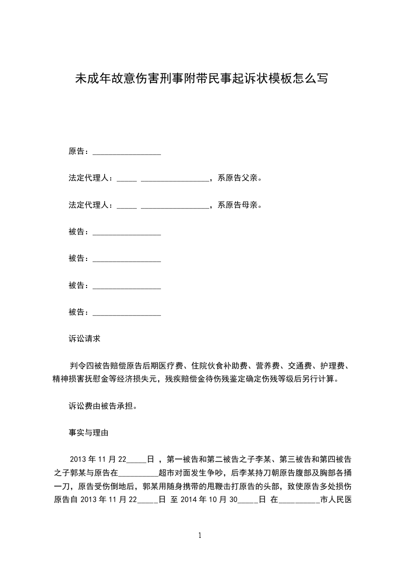 综上所述,四被告之子李某、郭某故意伤害原告,造成原告医疗费等经济损失,四被告作为父母未尽到监护责任,应对二未成年人的伤害行为承担民事责任,且刑事附带民事判决书中确定了四被告的赔偿义务。因此,对于原判决未包含部分的损失四被告仍应赔偿。故原告特提起诉讼,请求依法判令四被告赔偿原告在原判决未包含的医疗费、住院伙食补助费、营养费、交通费、护理费、精神损害抚慰金等经济损失元,残疾赔偿金待伤残鉴定确定伤残等级后另行计算。以保护原告的合法权益。