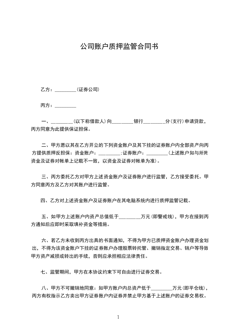 九、甲方不可撤销地同意:如借款人届期未还清借款,丙方有权仅持贷款行出具的借款人未还清借款的证明,指示乙方卖出甲方证券账户内证券并扣划甲方资金账户内款项至丙方指定的账户。乙方同意予以办理。证券合同:账户质押监管协议书由精品信息网整理!