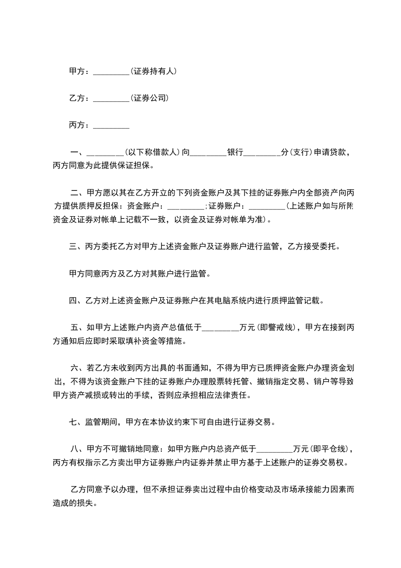 八、甲方不可撤销地同意:如甲方账户内总资产低于_________万元(即平仓线),丙方有权指示乙方卖出甲方证券账户内证券并禁止甲方基于上述账户的证券交易权。乙方同意予以办理,但不承担证券卖出过程中由价格变动及市场承接能力因素而造成的损失。