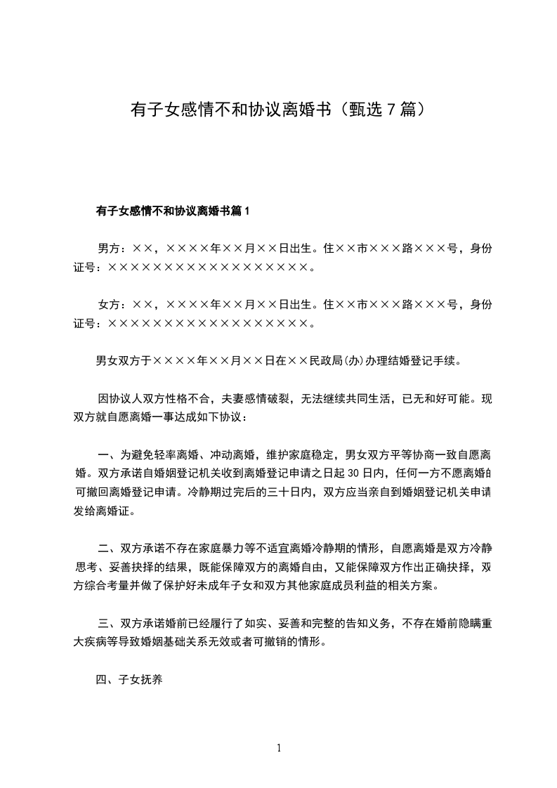 双方于________年________月________日在________________人民政府的民政部门登记结婚,婚后一个子女,因双方性格不和,无法共同生活,自愿离婚,经双方协商一致,订立离婚协议如下: