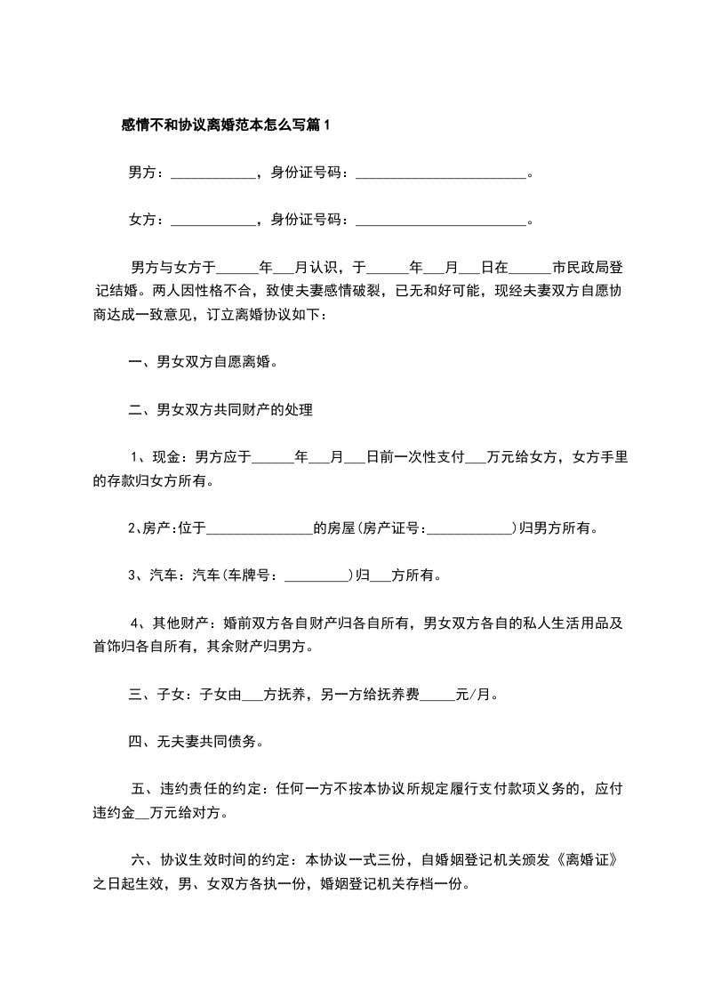 我们双方于_____年_____月_____日办理结婚登记,因婚后感情不和,现夫妻关系已彻底破裂,经反复冷静思考,我们自愿离婚,解除夫妻关系,经男女双方协商,一致达成如下离婚协议: