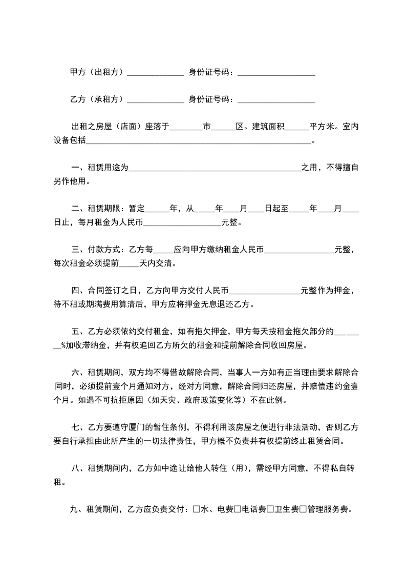 七、乙方要遵守厦门的暂住条例,不得利用该房屋之便进行非法活动,否则乙方要自行承担由此所产生的一切法律责任,甲方概不负责并有权提前终止租赁合同。