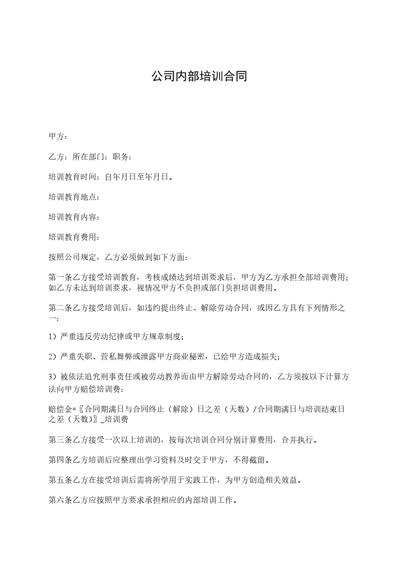 第六条乙方应按照甲方要求承担相应的内部培训工作。