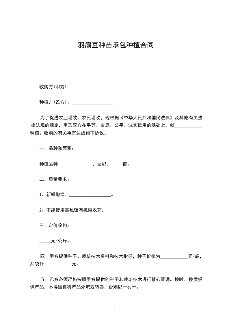 为了促进农业增效、农民增收,现根据《中华人民共和国民法典》及其他有关法律法规的规定,甲乙双方在平等、自愿、公平、诚实信用的基础上,就____________种植、收购的有关事宜达成如下协议。