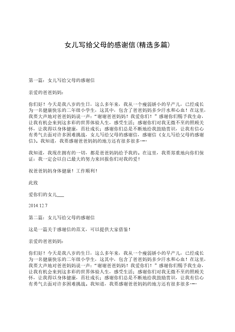 你们好!今天是我八岁的生日,这么多年来,我从一个瘦弱娇小的早产儿,已经成长为一名健康快乐的二年级小学生,这其中,包含了爸爸妈妈多少汗水和心血!在这里,我要大声地对爸爸妈妈说一声:“谢谢爸爸妈妈!我爱你们!”感谢你们赐予我生命,让我有机会来到这多彩的世界体验人生,感受生活;感谢你们对我无微不至的照顾关怀,让我得以身体健康,茁壮成长;感谢你们总是不断地给我鼓励赏识,让我有信心有勇气去面对许多困难挑战,女儿写给父母的感谢信,感谢信《女儿写给父母的感谢信》。我知道,我要感谢爸爸妈妈的地方还有很多很多……