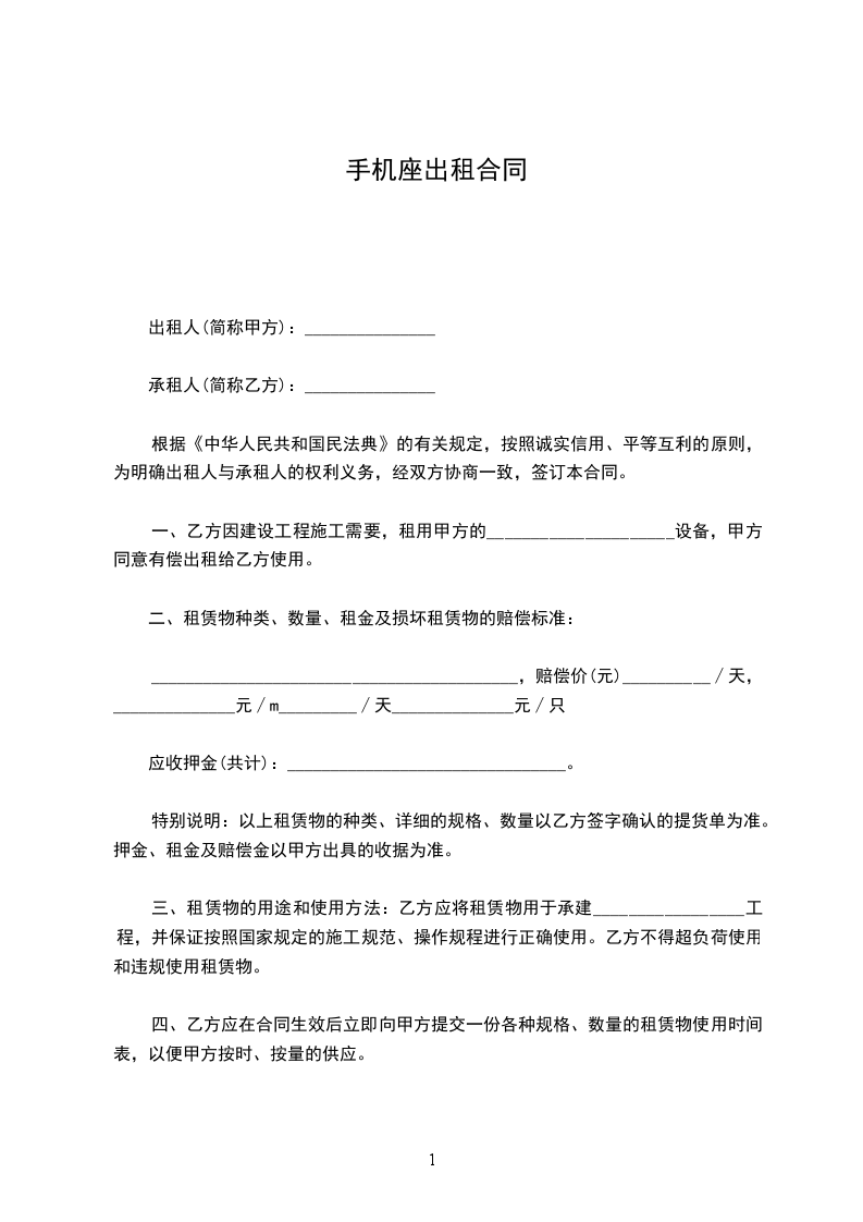 一、乙方因建设工程施工需要,租用甲方的_____________________设备,甲方同意有偿出租给乙方使用。