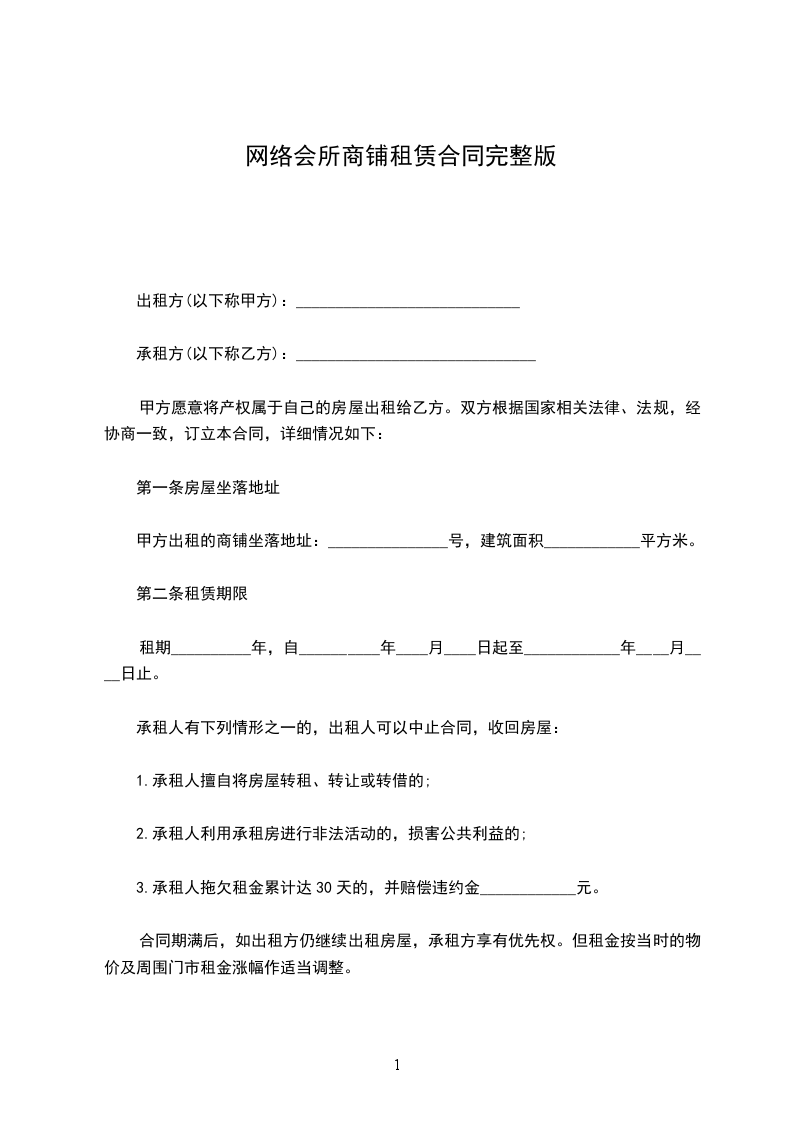 1.若甲方在乙方没有违反本合同的情况下提前解除合同或租给他人,视为甲方违约,负责赔偿违约金____________元。