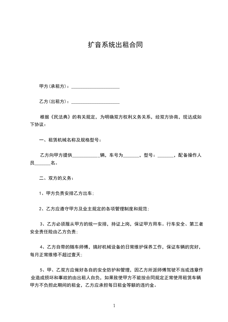 乙方向甲方提供____________辆,车号为_______,型号:_______,配备操作人员_______名。