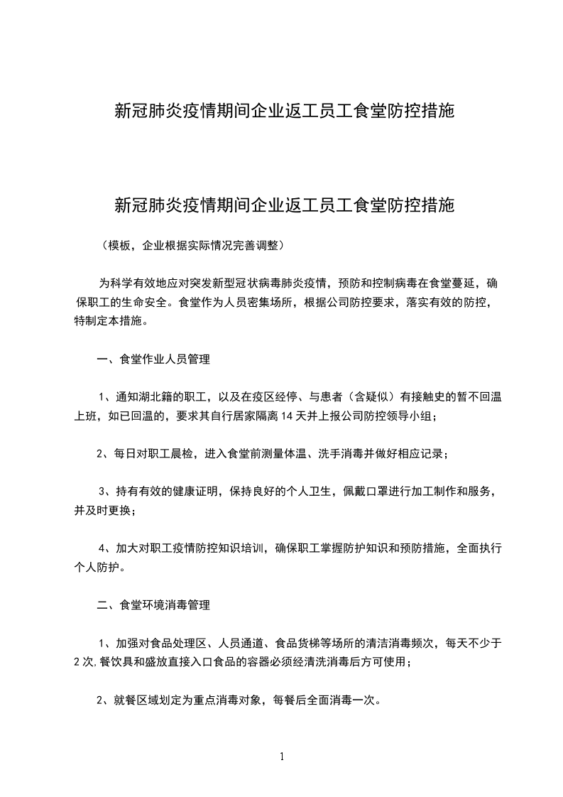 新冠肺炎疫情期间企业返工员工食堂防控措施