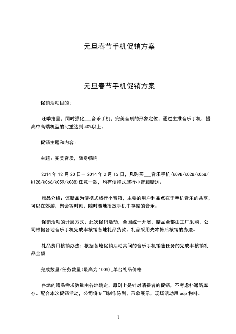 旺季抢量,同时强化___音乐手机,完美音质的形象定位,通过主推音乐手机,提高中高端机型的比重达到40%以上,元旦手机促销方案。
