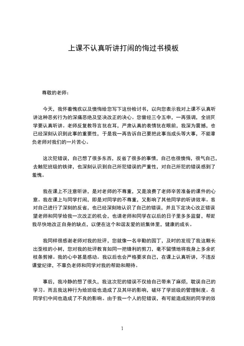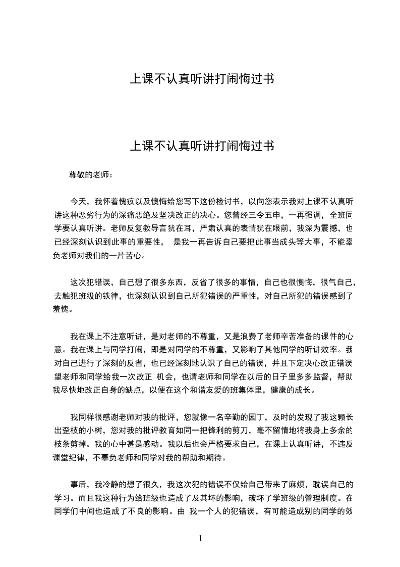 我在课上不注意听讲,是对老师的不尊重,又是浪费了老师辛苦准备的课件的心意。我在课上与同学打闹,即是对同学的不尊重,又影响了其他同学的听讲效率。我对自己进行了深刻的反省,也已经深刻地认识了自己的错误,并且下定决心改正错误,望老师和同学给我一次改正 机会,也请老师和同学在以后的日子里多多监督,帮助我尽快地改正自身的缺点,以便在这个和谐友爱的班集体里,健康的成长。