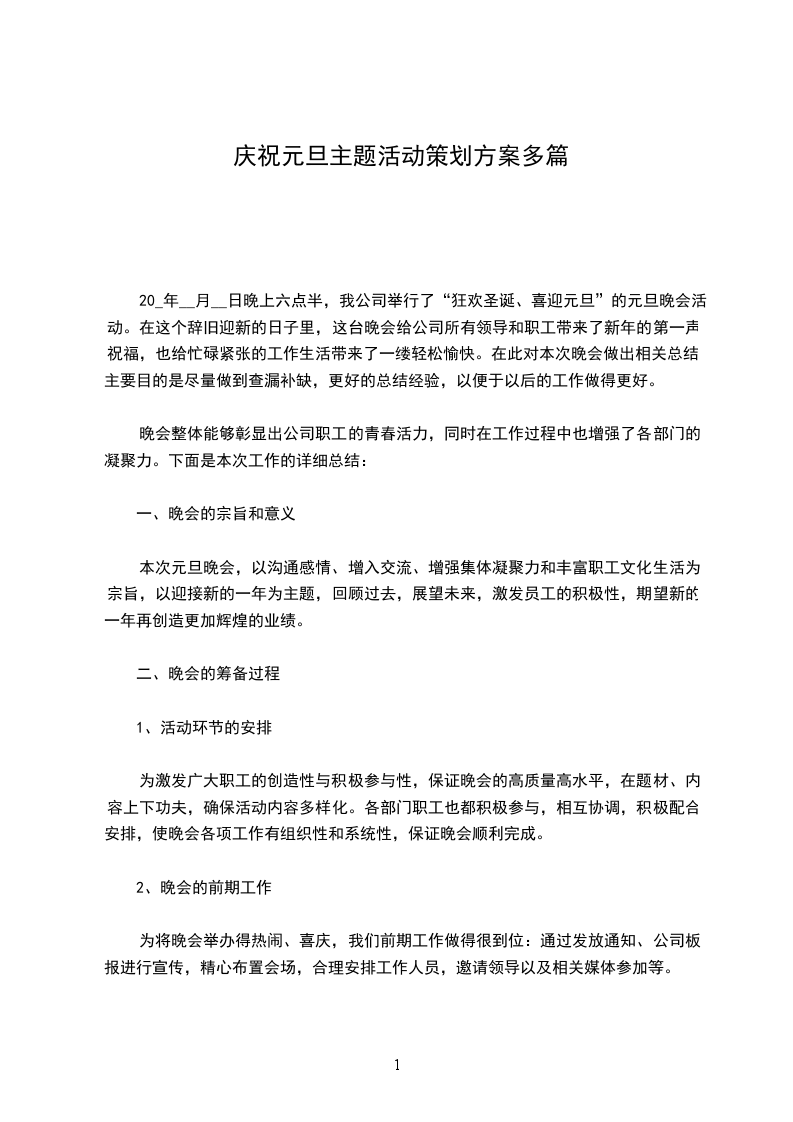 20_年__月__日晚上六点半,我公司举行了“狂欢圣诞、喜迎元旦”的元旦晚会活动。在这个辞旧迎新的日子里,这台晚会给公司所有领导和职工带来了新年的第一声祝福,也给忙碌紧张的工作生活带来了一缕轻松愉快。在此对本次晚会做出相关总结,主要目的是尽量做到查漏补缺,更好的总结经验,以便于以后的工作做得更好。