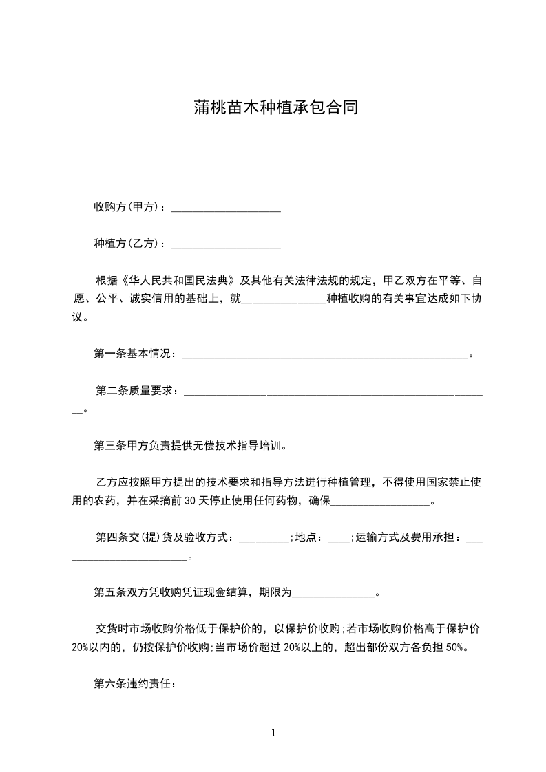 根据《华人民共和国民法典》及其他有关法律法规的规定,甲乙双方在平等、自愿、公平、诚实信用的基础上,就_______________种植收购的有关事宜达成如下协议。