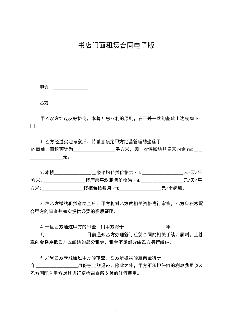 1.乙方经过实地考察后,特诚意预定甲方经营管理的坐落于__________________的商铺,面积预计为__________________平方米,现一次性缴纳租赁意向金rmb__________________元。