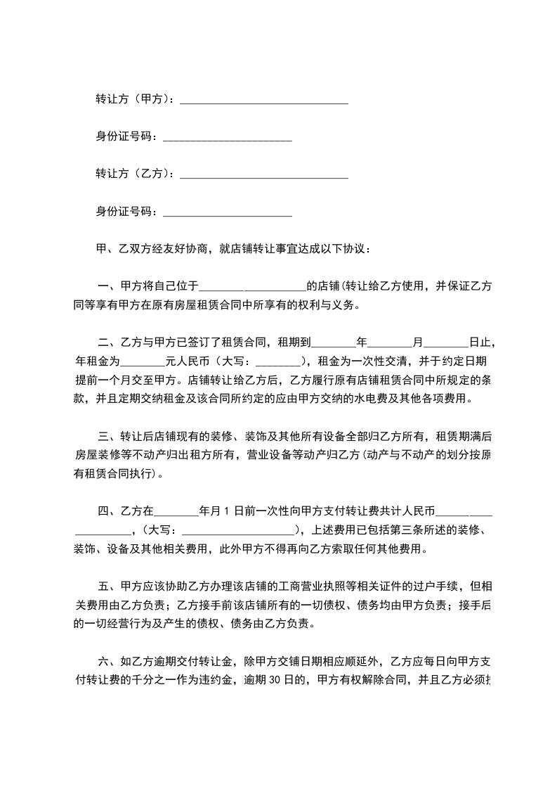 甲、乙双方经友好协商,就店铺转让事宜达成以下协议: