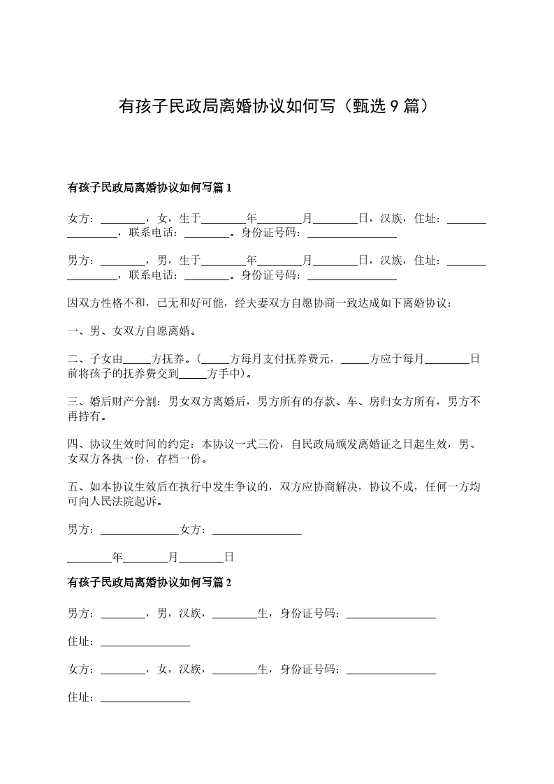 1、本协议一式三份,自婚姻登记机关颁发《离婚证》之日起生效,男、女双方各执一份,婚姻登记机关存档一份。