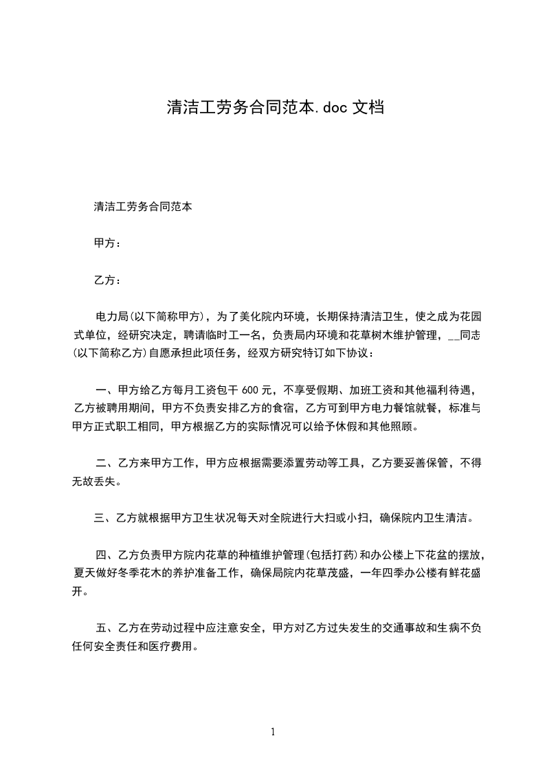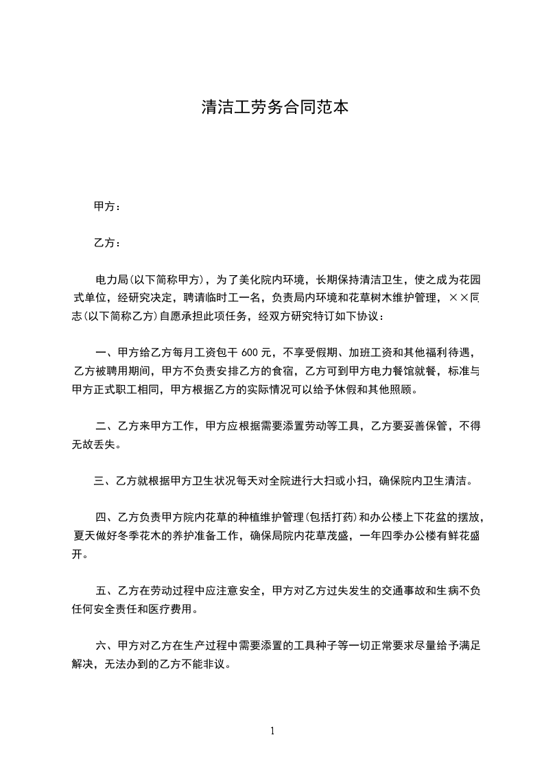 电力局(以下简称甲方),为了美化院内环境,长期保持清洁卫生,使之成为花园式单位,经研究决定,聘请临时工一名,负责局内环境和花草树木维护管理,××同志(以下简称乙方)自愿承担此项任务,经双方研究特订如下协议:
