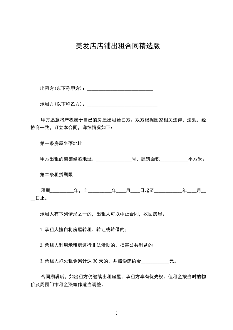 1.若甲方在乙方没有违反本合同的情况下提前解除合同或租给他人,视为甲方违约,负责赔偿违约金____________元。