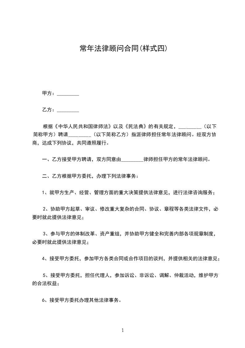根据《中华人民共和国律师法》以及《民法典》的有关规定,_________(以下简称甲方)聘请_________(以下简称乙方)指派律师担任常年法律顾问。经双方协商,达成下列协议,共同遵照履行。