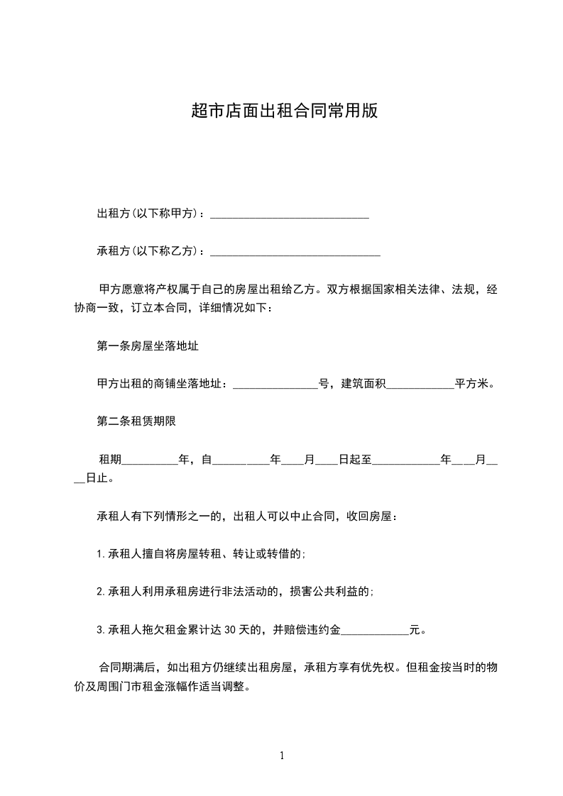 1.若甲方在乙方没有违反本合同的情况下提前解除合同或租给他人,视为甲方违约,负责赔偿违约金____________元。