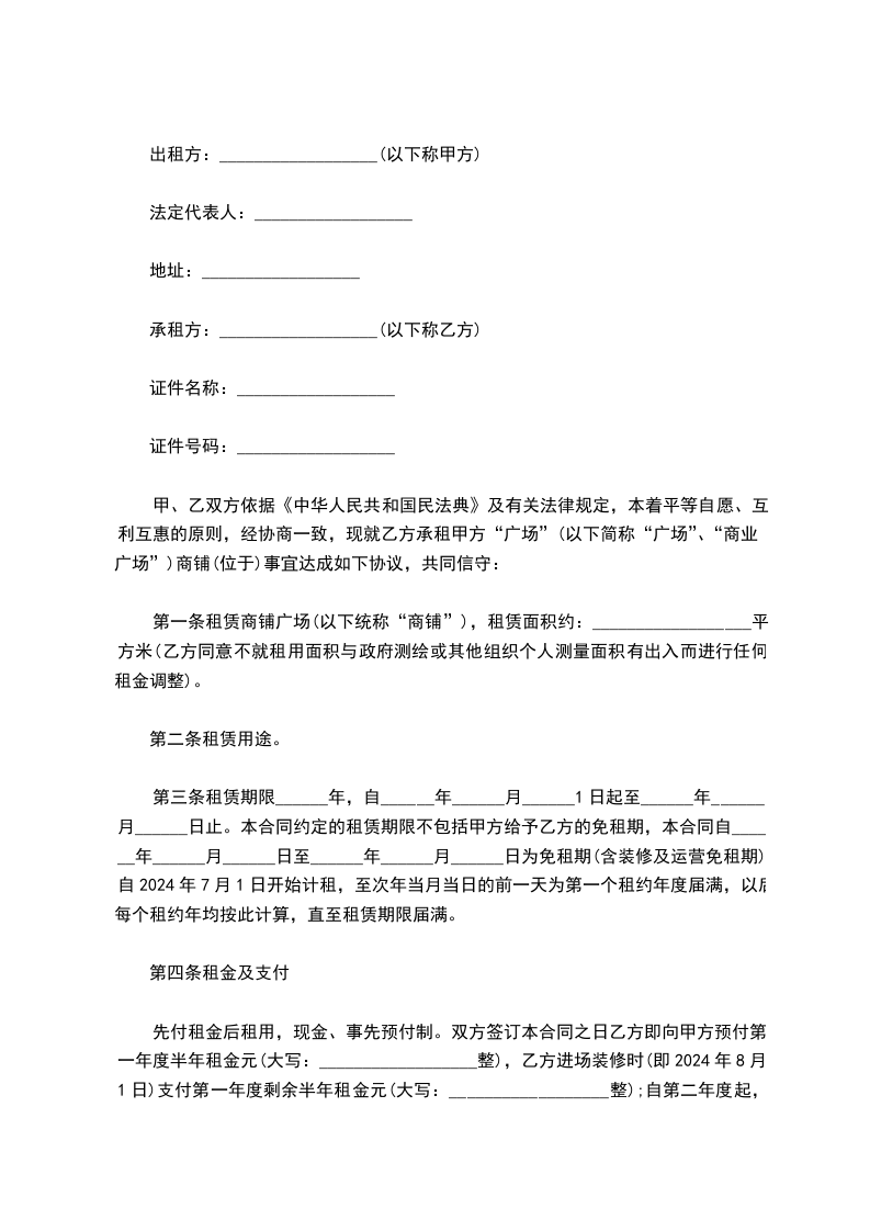 甲方出租的商铺坐落地址:_______________号,建筑面积____________平方米。