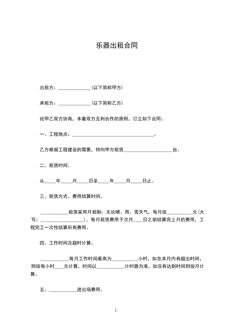 三、租金及支付:月租,每月租金__________元整(大写:__________元)人民币,__________工作时间为________________小时/月,如果因甲方及其他非乙方原因造成停工、停产或气候原因以致完不成工作,均由甲方自行负责,乙方租金仍按月租标准计收,甲方应保证乙方按月累计________天的维修时间,超出2天以上部分甲方则可扣除超出天数的租金。若月度使用不足________________小时,仍按一个月租金计算支付。超出小时则按__________元/小时进行结算。