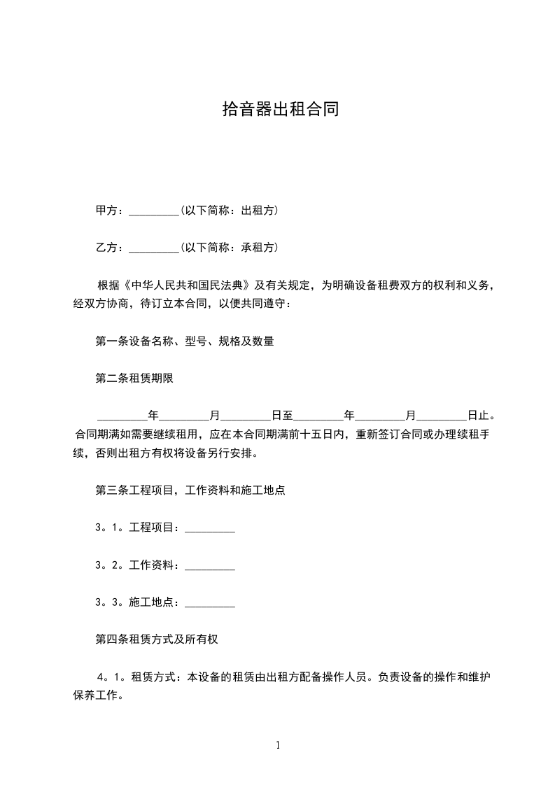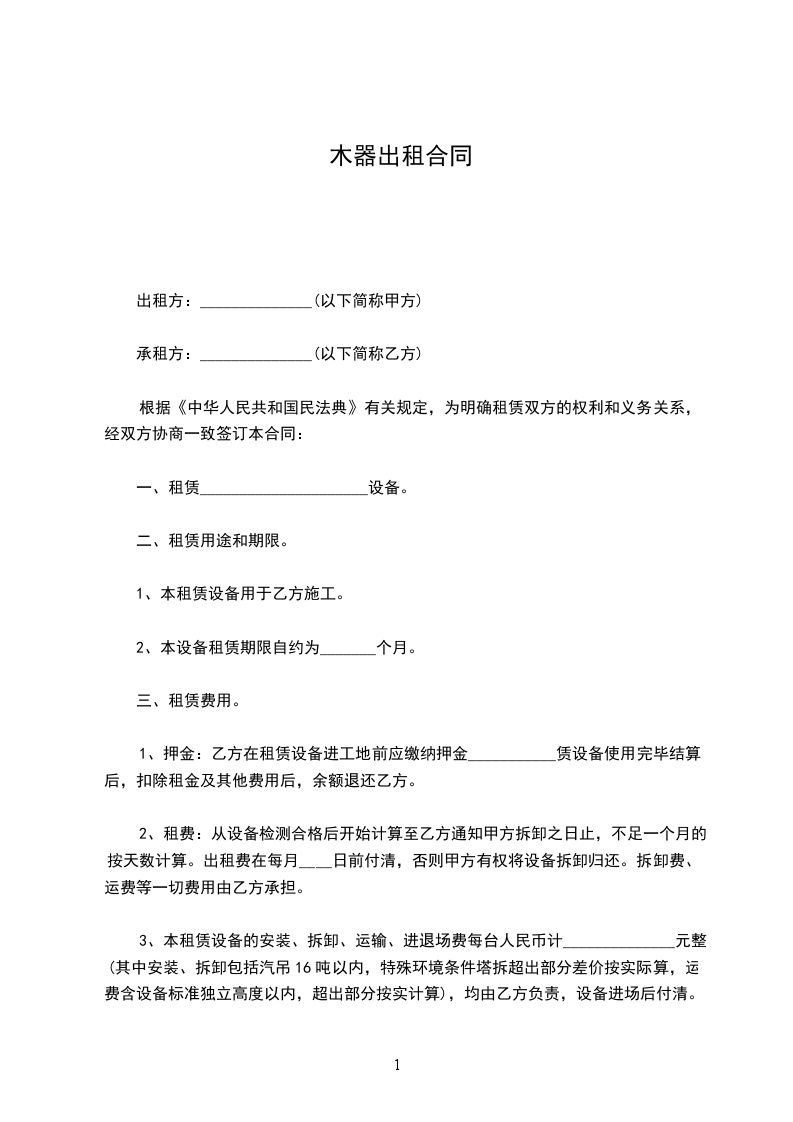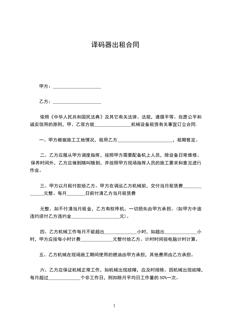 因工程需要,甲方租用乙方________________________________机械设备,本着公正、公平、合理的原理,经双方友好协商,按《中华人民共和国民法典》的有关规定,达成如下协议: