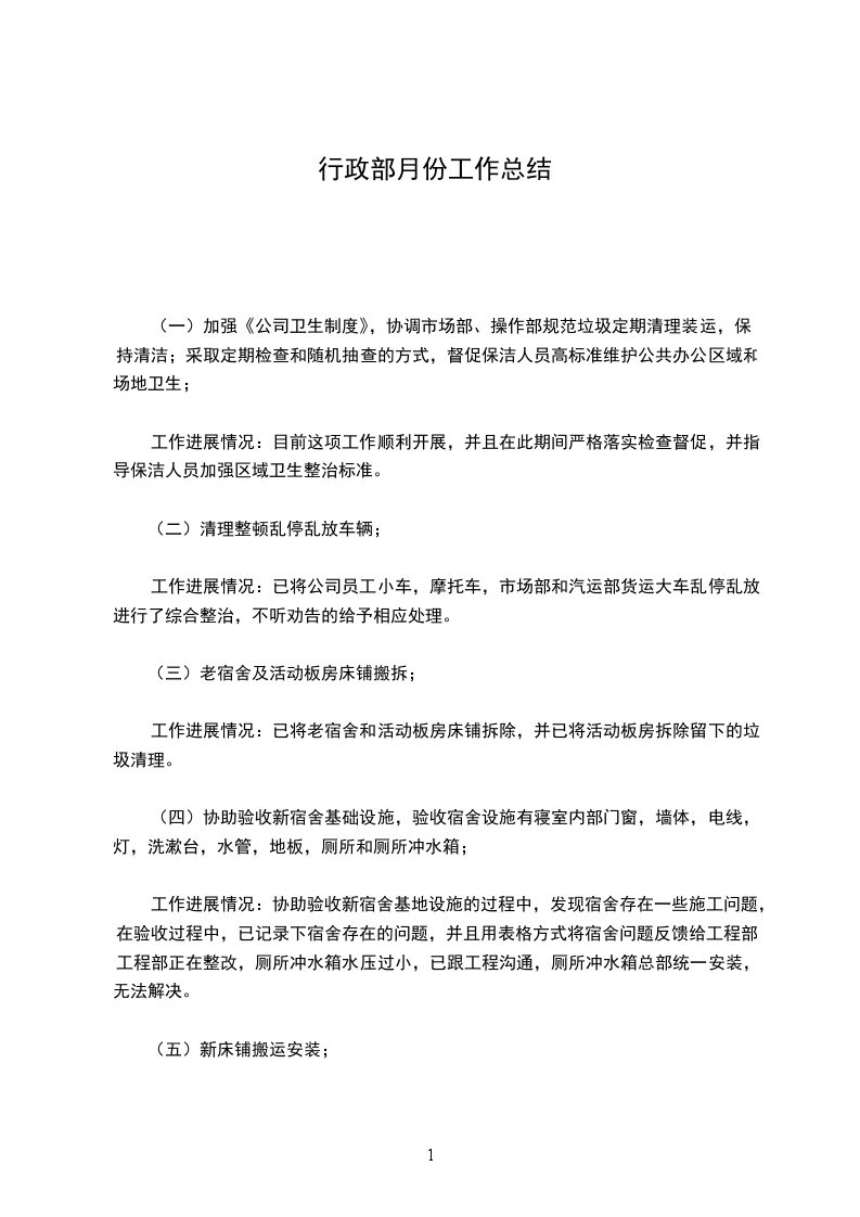 (一)加强《公司卫生制度》,协调市场部、操作部规范垃圾定期清理装运,保持清洁;采取定期检查和随机抽查的方式,督促保洁人员高标准维护公共办公区域和场地卫生;