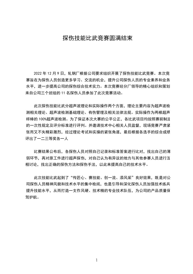 此次技能比武起到了“传匠心、赛技能、创一流、添风采”良好效果,既是对公司探伤人员精神风貌和技术水平的集中检阅,也是引导和深化探伤人员加强技术练兵,提升技能水平,从而打造一支作风硬、技术精的专业技术队伍,为公司的产品质量保驾护航。