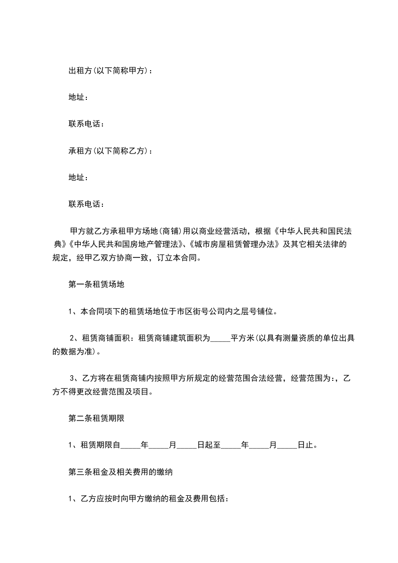 甲方就乙方承租甲方场地(商铺)用以商业经营活动,根据《中华人民共和国民法典》《中华人民共和国房地产管理法》、《城市房屋租赁管理办法》及其它相关法律的规定,经甲乙双方协商一致,订立本合同。
