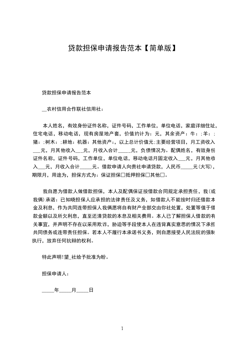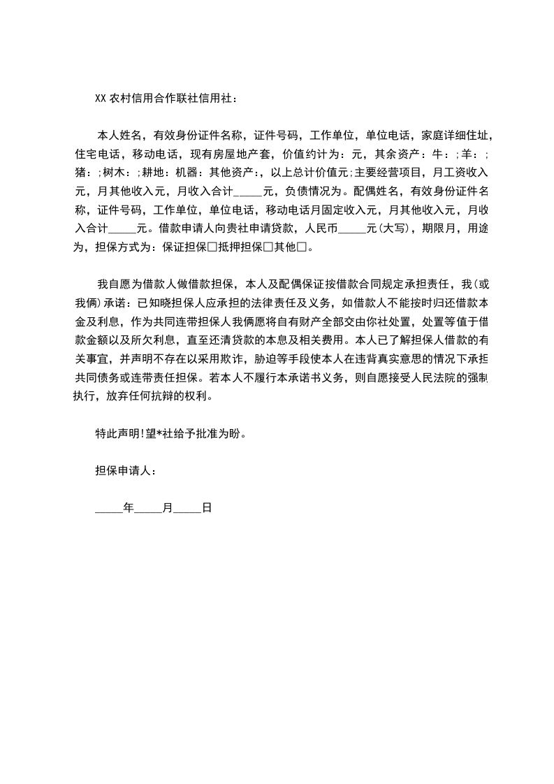 本人姓名,有效身份证件名称,证件号码,工作单位,单位电话,家庭详细住址,住宅电话,移动电话,现有房屋地产套,价值约计为:元,其余资产:牛:;羊:;猪:;树木:;耕地:机器:其他资产:,以上总计价值元;主要经营项目,月工资收入元,月其他收入元,月收入合计_____元,负债情况为。配偶姓名,有效身份证件名称,证件号码,工作单位,单位电话,移动电话月固定收入元,月其他收入元,月收入合计_____元。借款申请人向贵社申请贷款,人民币_____元(大写),期限月,用途为,担保方式为:保证担保□抵押担保□其他□。