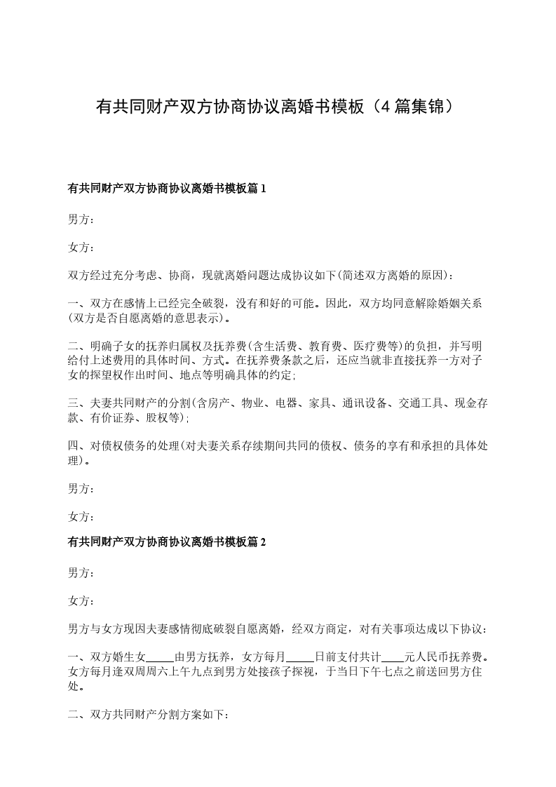男方与女方于 年 月认识,于 年 月 日在 登记结婚,婚后于 年 月 日生育一儿子/女儿,名 。因 致使夫妻感情破裂,已无和好可能,现经夫妻双方自愿协商达成一致意见,订立离婚协议如下:
