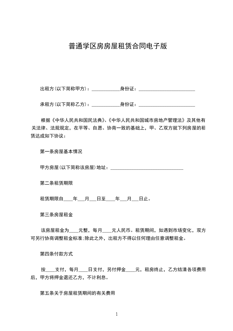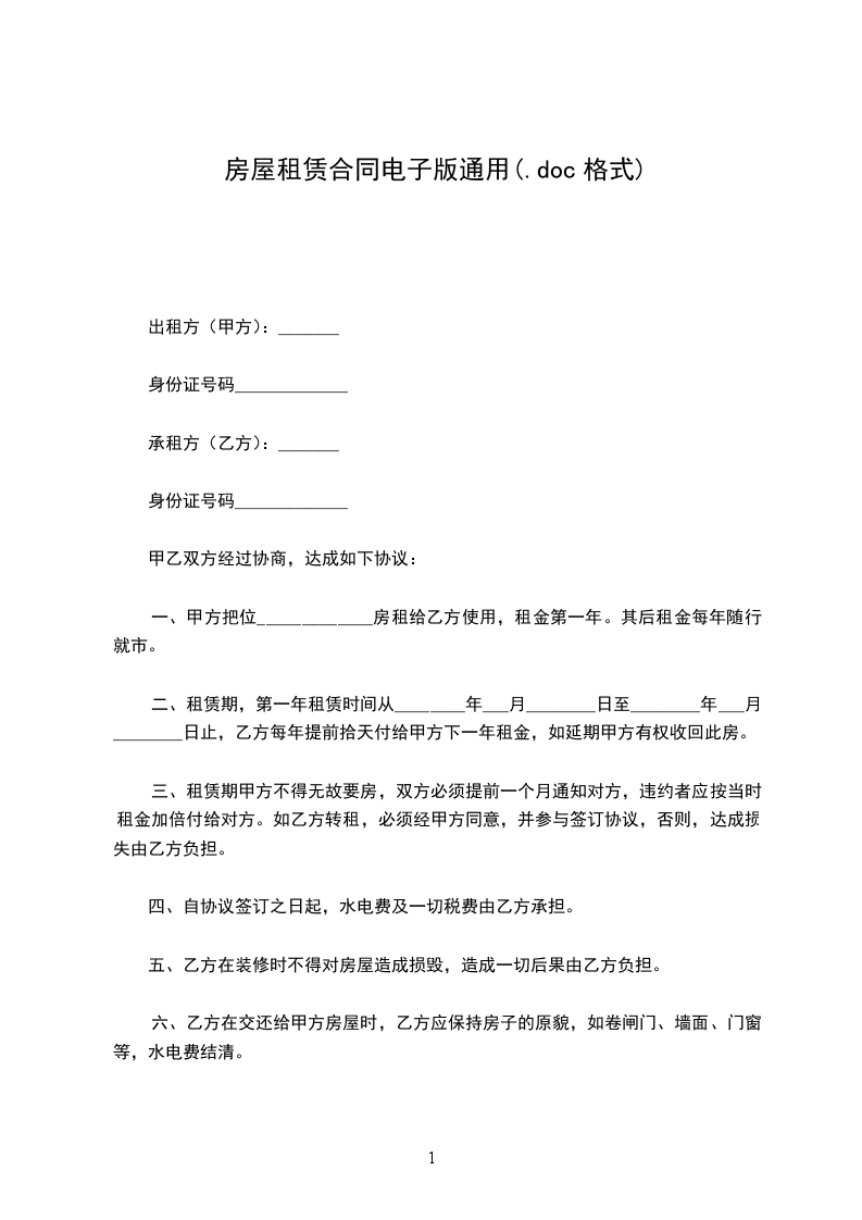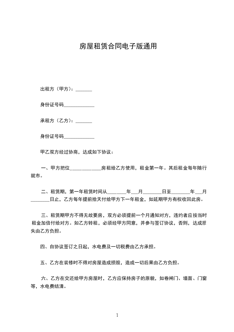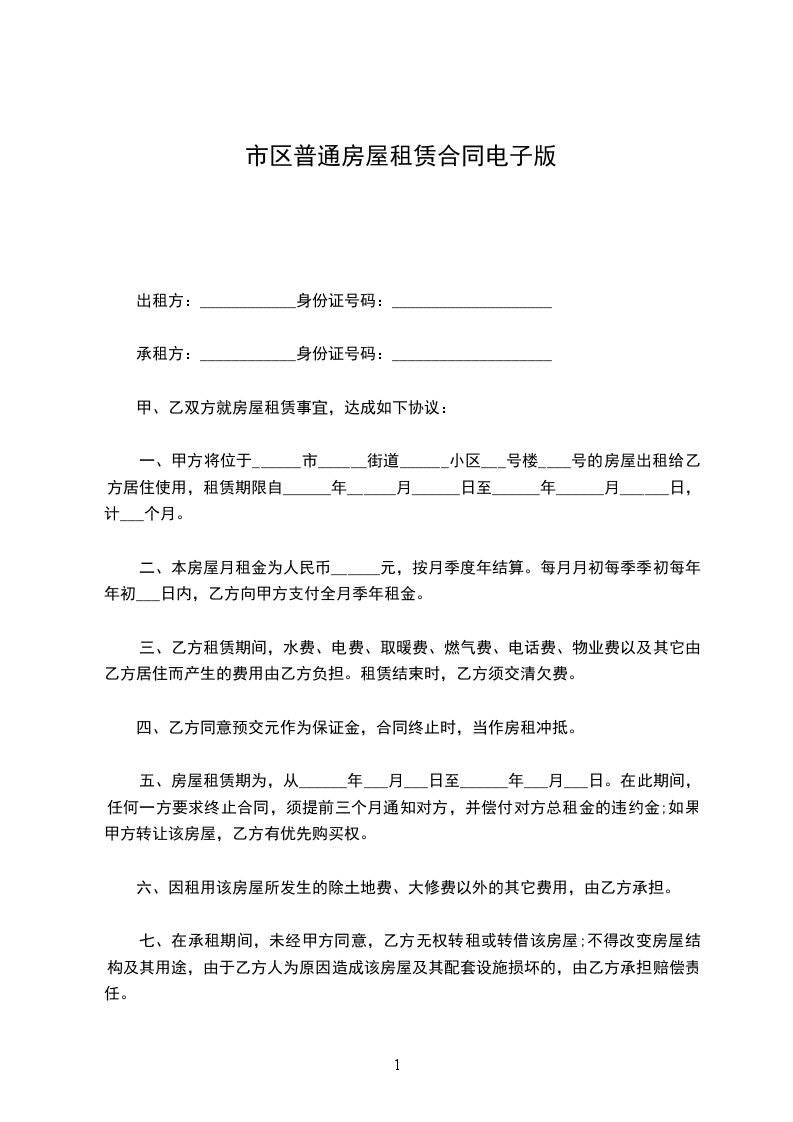 七、认真看所有条款后再签订你已经花了很多时间找房子、看房子,一定不要吝惜这么点时间去仔细阅读所有租房条款,有不清楚的一定要问清。细节问题可以补充到合同或者补充协议上,谨防霸王条款。不要理会他人催促,因为你是要履行合约的人。合同一般一式两份或三份,且有身份证号码电话信息,双方签名后即生效。(即正规些的合同都需要有这些信息的,只签名不行哦)租房合同签订好之后即刻生效,跟你的租期起始时间无关。所以想好了再签订,签好之后自觉履约。甲方(出租方)身份证号:地址乙方(承租方)身份证号:地址经甲、乙双方在平等、自愿、互利的基础上,友好协商,达成以下协议: