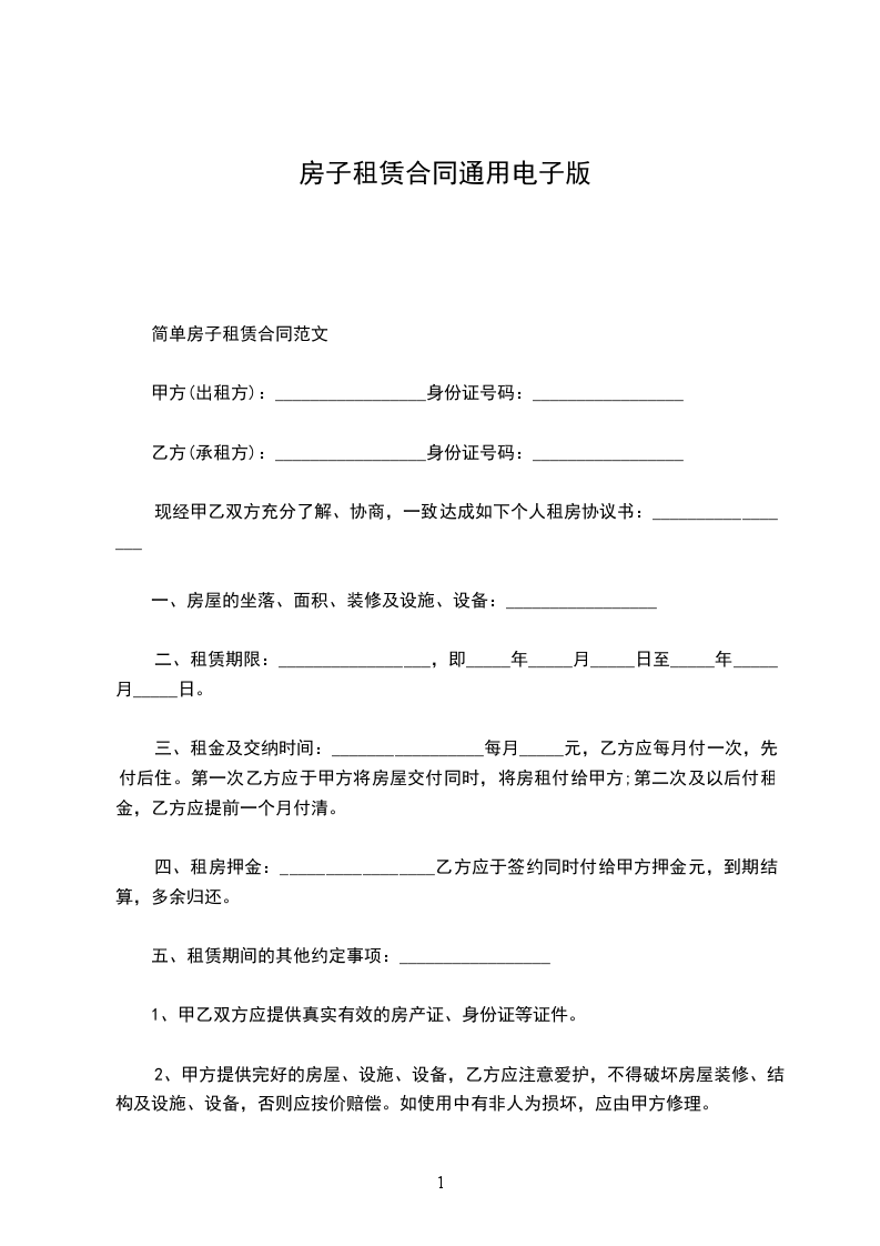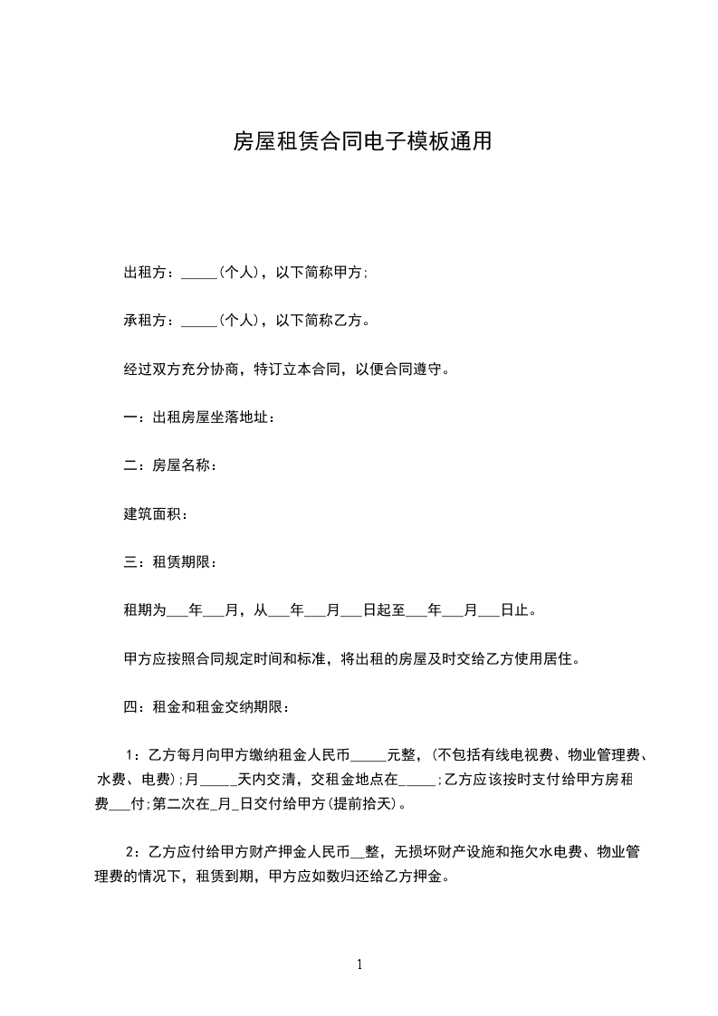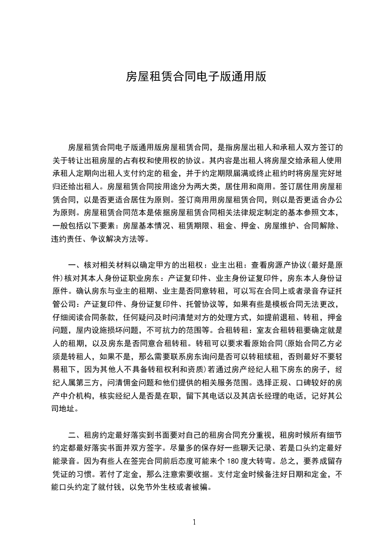 房屋租赁合同电子版通用版房屋租赁合同,是指房屋出租人和承租人双方签订的关于转让出租房屋的占有权和使用权的协议。其内容是出租人将房屋交给承租人使用,承租人定期向出租人支付约定的租金,并于约定期限届满或终止租约时将房屋完好地归还给出租人。房屋租赁合同按用途分为两大类,居住用和商用。签订居住用房屋租赁合同,以是否更适合居住为原则。签订商用用房屋租赁合同,则以是否更适合办公为原则。房屋租赁合同范本是依据房屋租赁合同相关法律规定制定的基本参照文本,一般包括以下要素:房屋基本情况、租赁期限、租金、押金、房屋维护、合同解除、违约责任、争议解决方法等。