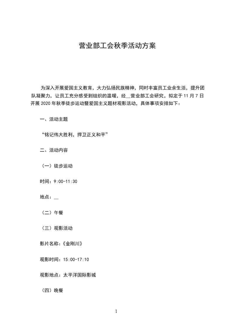 为深入开展爱国主义教育,大力弘扬民族精神,同时丰富员工业余生活,提升团队凝聚力,让员工充分感受到组织的温暖,经__营业部工会研究,拟定于11月7日开展2024年秋季徒步运动暨爱国主义题材观影活动,具体事项安排如下:
