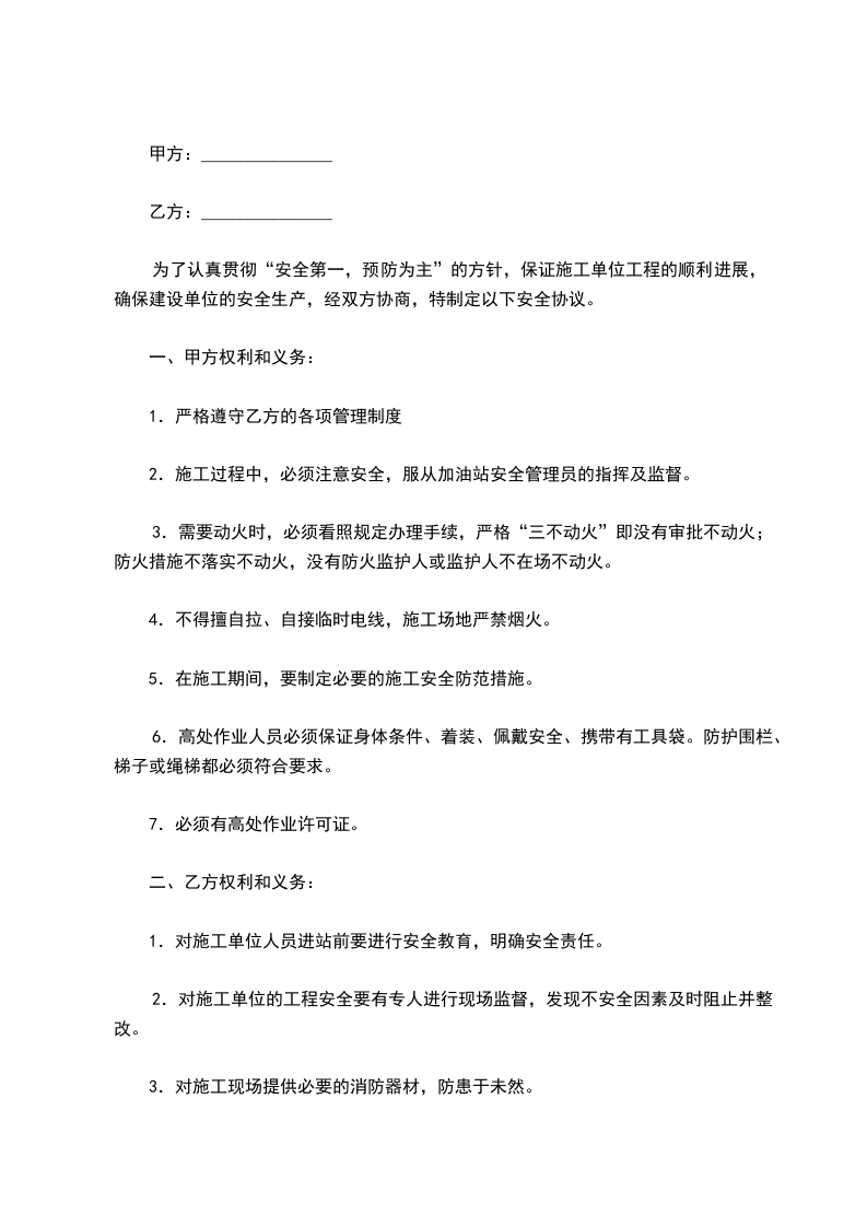 为了认真贯彻“安全第一,预防为主”的方针,保证施工单位工程的顺利进展,确保建设单位的安全生产,经双方协商,特制定以下安全协议。