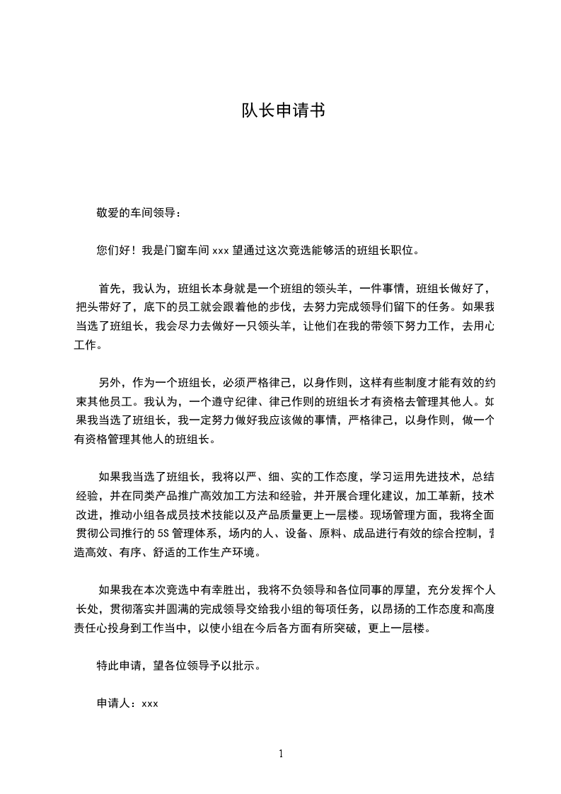 您们好!我是门窗车间xxx望通过这次竞选能够活的班组长职位。
