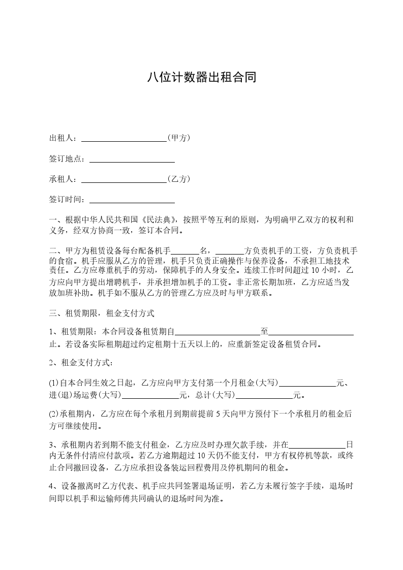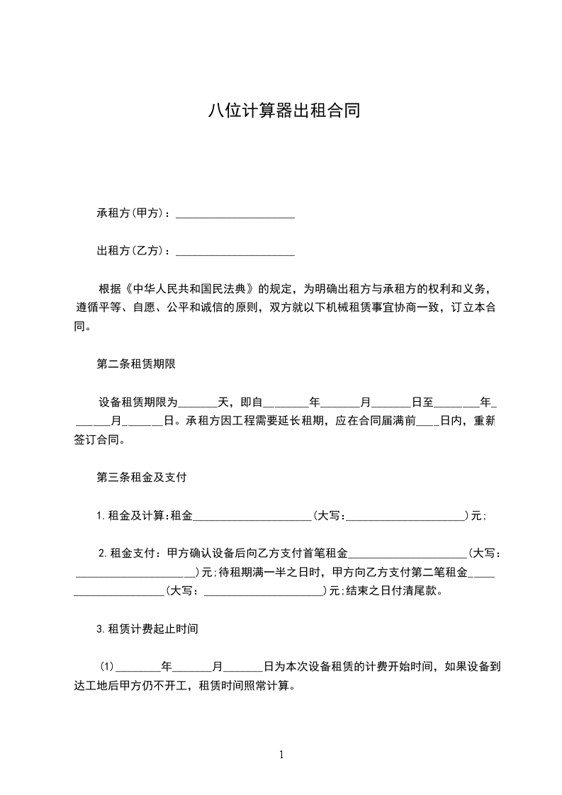 根据《中华人民共和国民法典》的规定,为明确出租方与承租方的权利和义务,遵循平等、自愿、公平和诚信的原则,双方就以下机械租赁事宜协商一致,订立本合同。