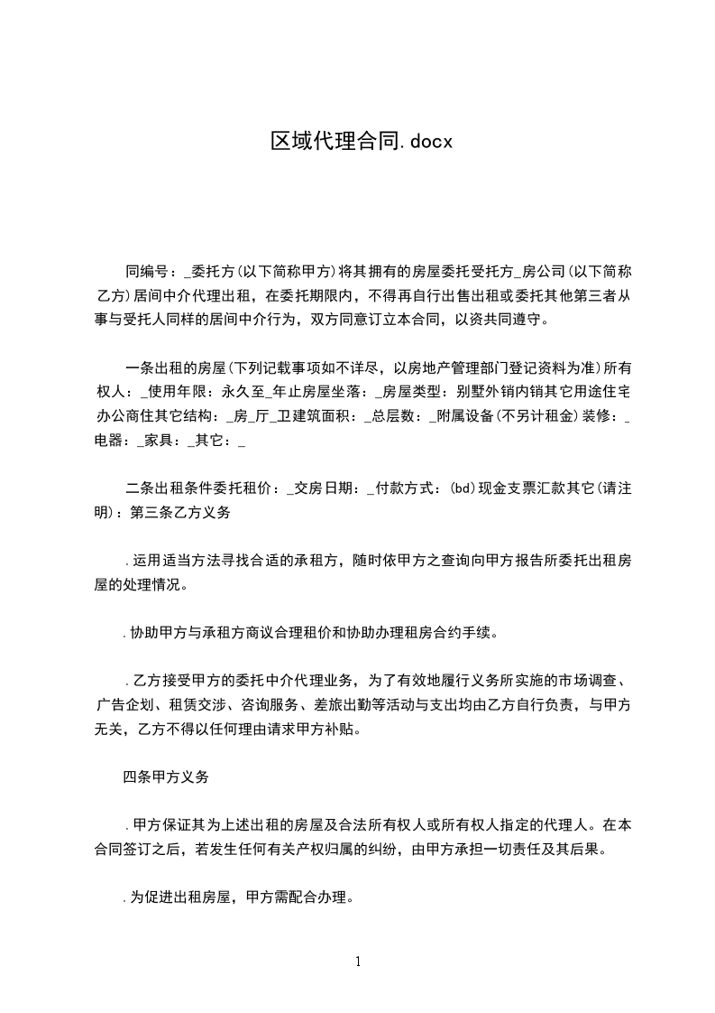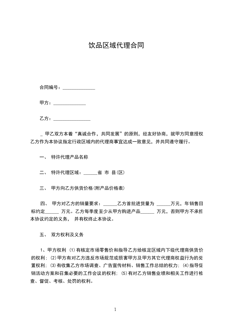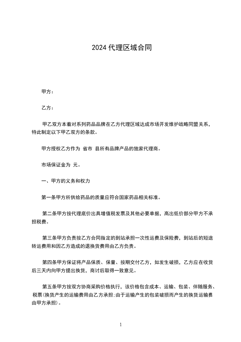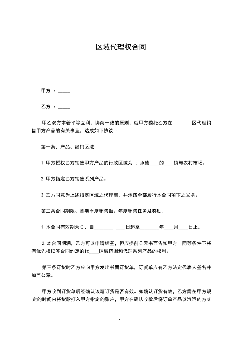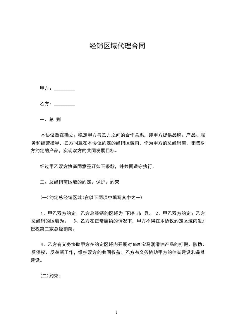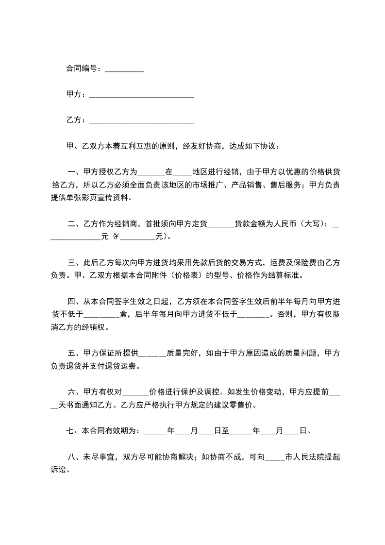 一、甲方授权乙方为_______在_____地区进行经销,由于甲方以优惠的价格供货给乙方,所以乙方必须全面负责该地区的市场推广、产品销售、售后服务;甲方负责提供单张彩页宣传资料。