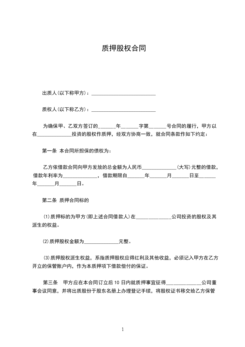 第三条 甲方应在本合同订立后10日内就质押事宜征得_____公司董事会议同意,并将出质股份于股东名册上办理登记手续,将股权证书移交给乙方保管。