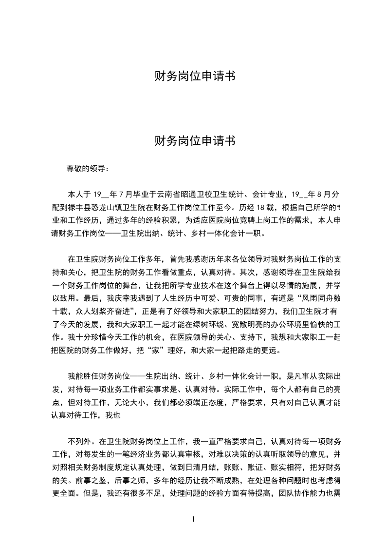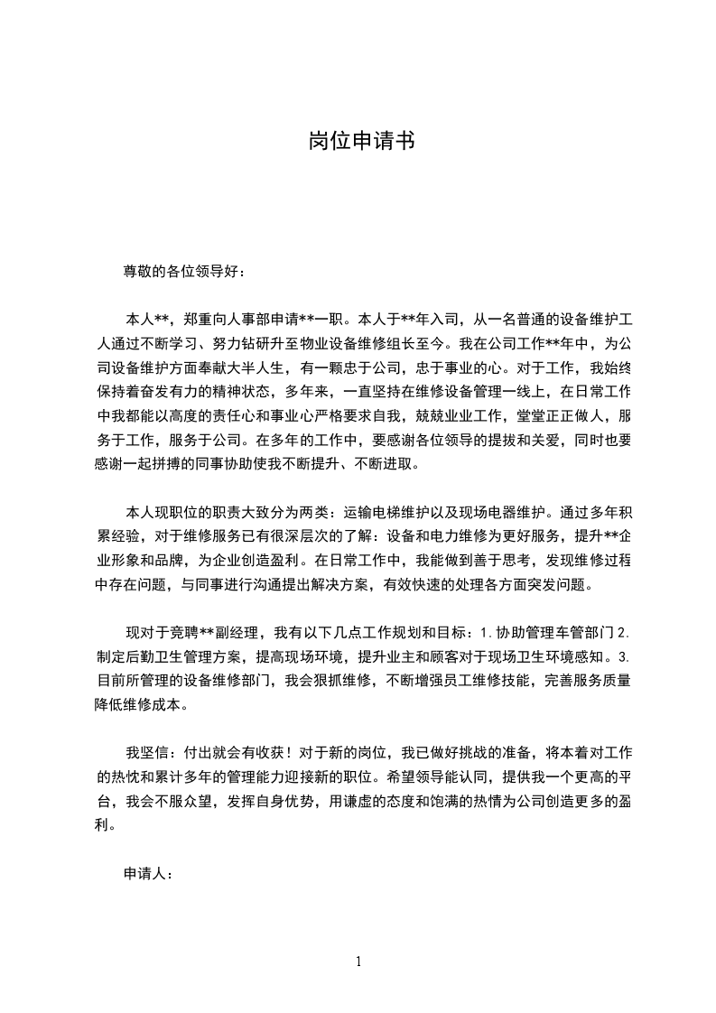 本人**,郑重向人事部申请**一职。本人于**年入司,从一名普通的设备维护工人通过不断学习、努力钻研升至物业设备维修组长至今。我在公司工作**年中,为公司设备维护方面奉献大半人生,有一颗忠于公司,忠于事业的心。对于工作,我始终保持着奋发有力的精神状态,多年来,一直坚持在维修设备管理一线上,在日常工作中我都能以高度的责任心和事业心严格要求自我,兢兢业业工作,堂堂正正做人,服务于工作,服务于公司。在多年的工作中,要感谢各位领导的提拔和关爱,同时也要感谢一起拼搏的同事协助使我不断提升、不断进取。