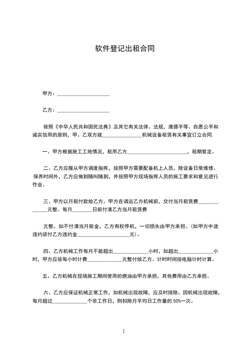 依照《中华人民共和国民法典》及其它有关法律、法规,遵循平等、自愿公平和诚实信用的原则,甲、乙双方就________________机械设备租赁有关事宜订立合同.